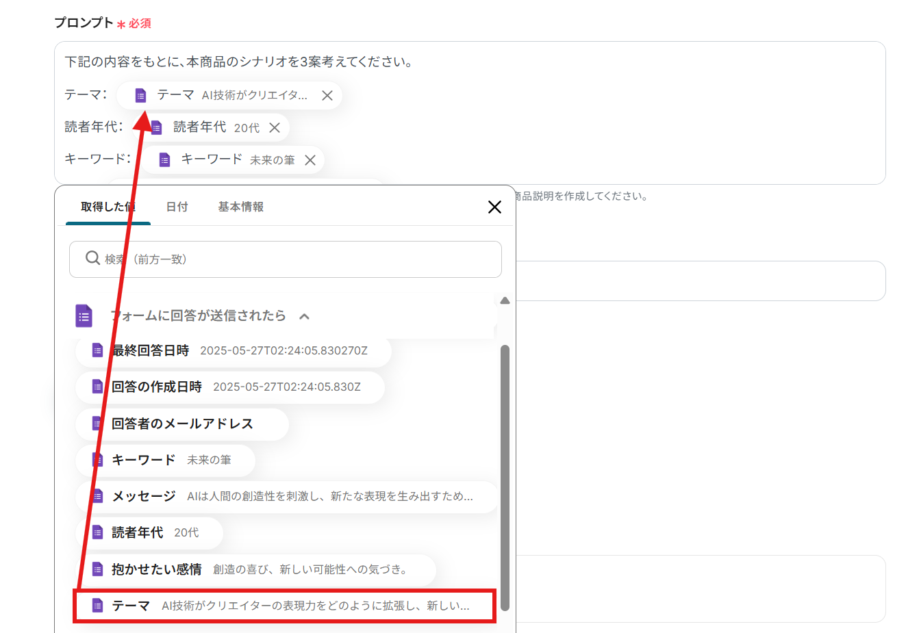 プロンプト:編集欄をクリックするとGoogleフォームから取得した情報を引用できます。