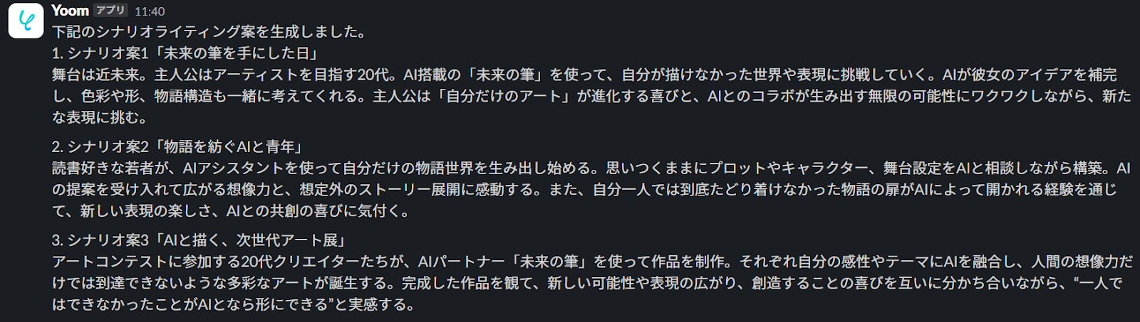 もし、AIがアイデア出しからシナリオ骨子の作成までをサポートし、完成したシナリオをチャットツールなどに自動で通知・共有できるようになれば、これらの悩みから解放され、より創造的な活動や他の重要な業務に集中できる貴重な時間を確保できるようになりそうですよね!