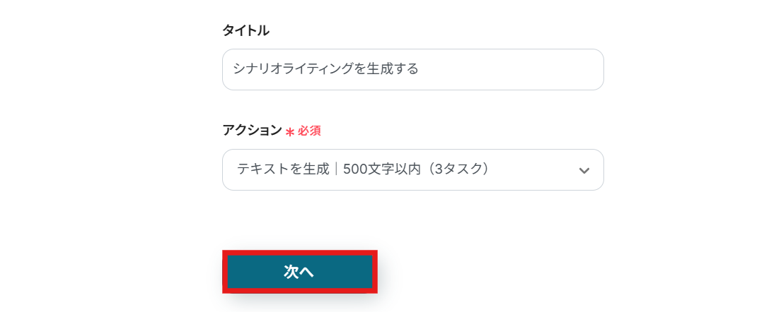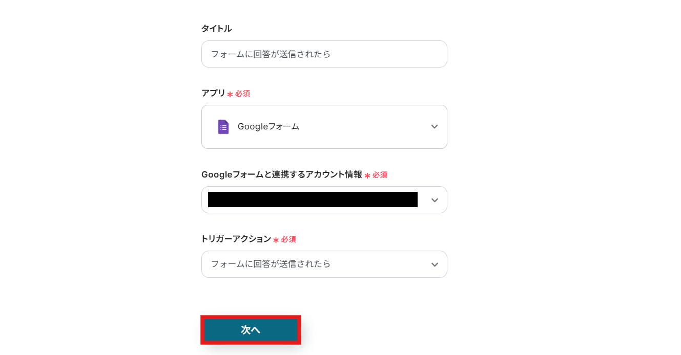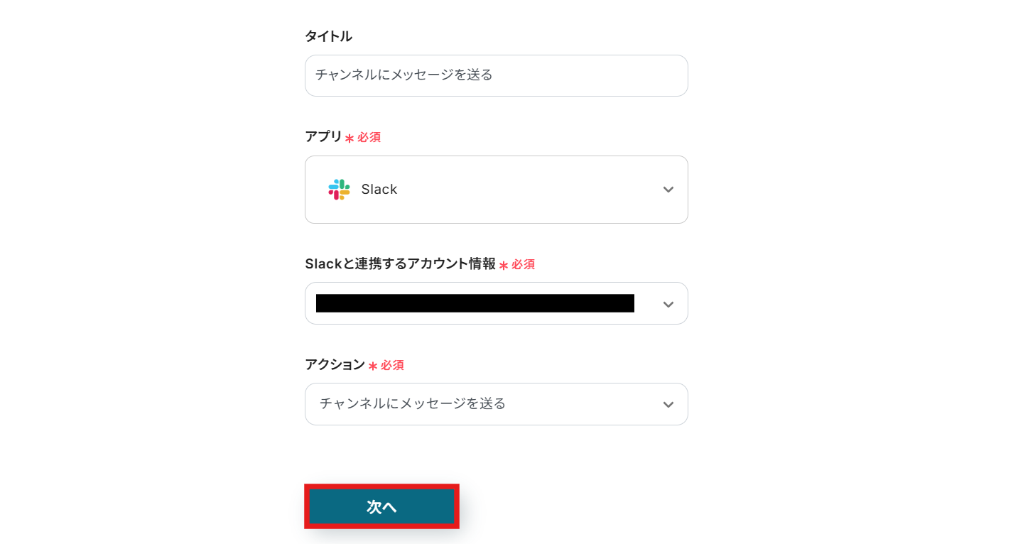 タイトルと連携するアカウント情報を任意で設定し、アクションはテンプレート通りのまま「次へ」をクリックして進んでください。