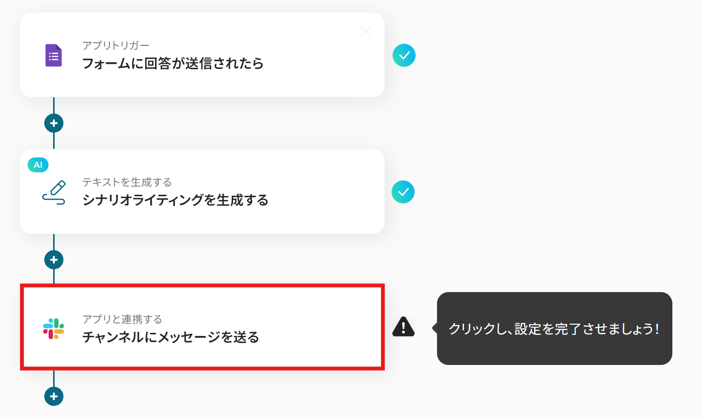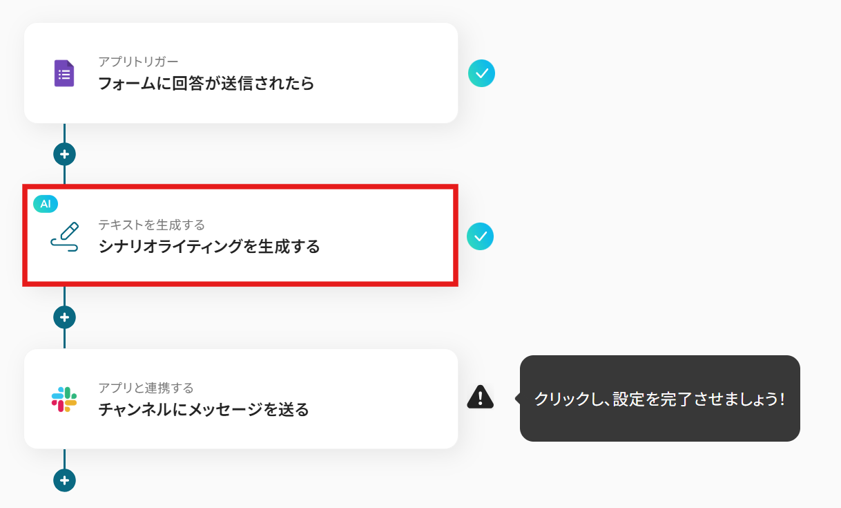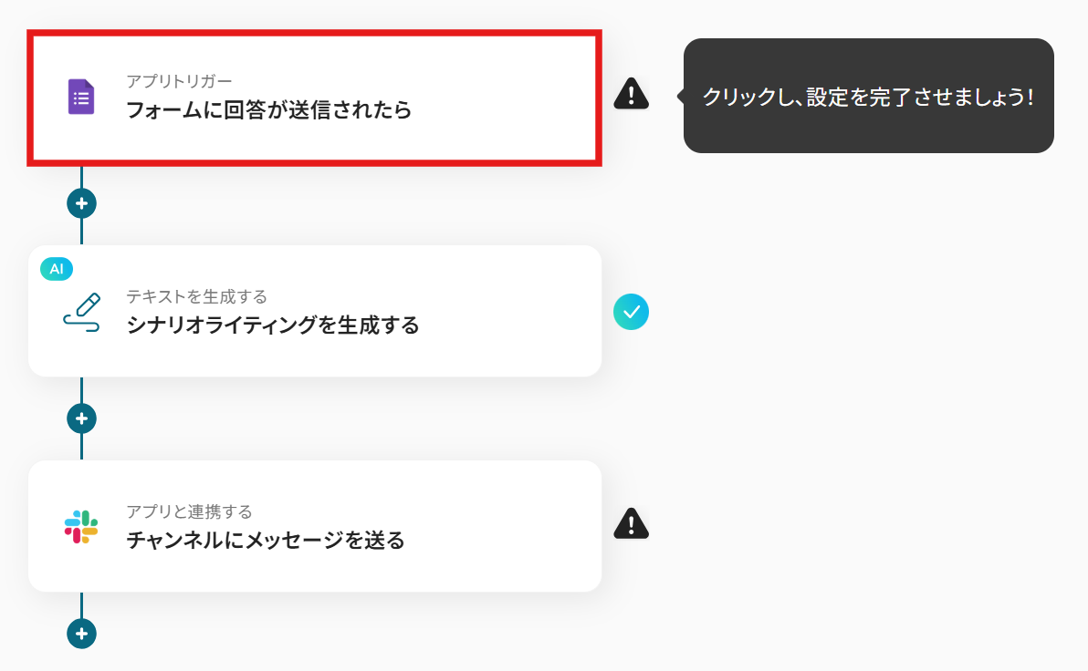 それではここから代表的な例として、Googleフォームで受け付けた回答を基に、AIがシナリオを自動生成し、その結果をSlackへ通知するフローを解説していきます!