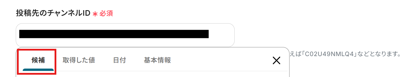 投稿先のチャンネルID:入力欄をクリックすると候補が表示されるので、その中から選択しましょう。