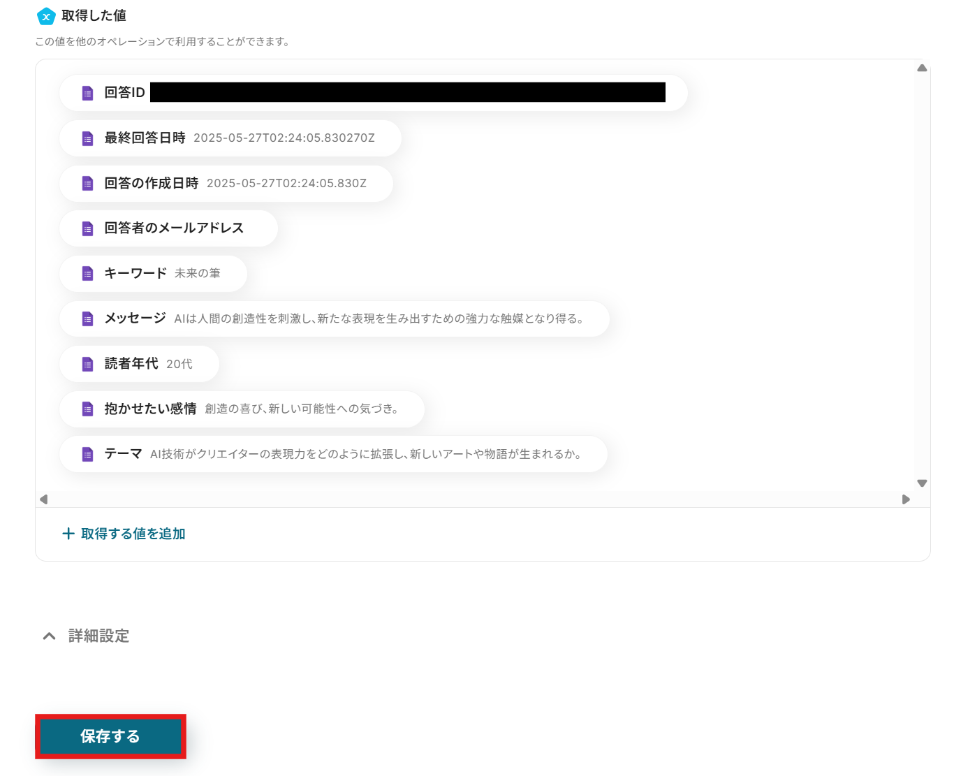 テストが成功すると「テスト成功」の画面が表示され、Googleフォームから取得した情報を引用できるようになります。