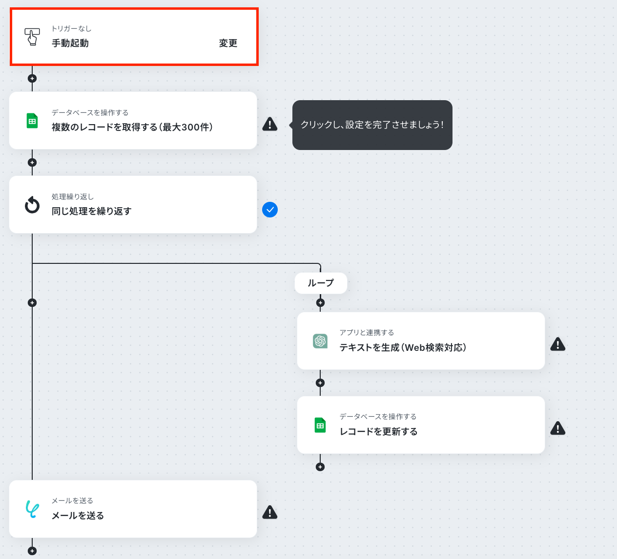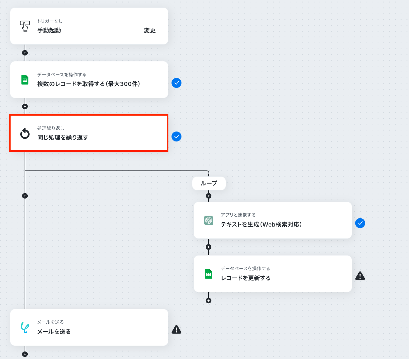 - Google スプレッドシートのアクション設定、繰り返し処理の設定、ChatGPTのアクション設定、メールの設定