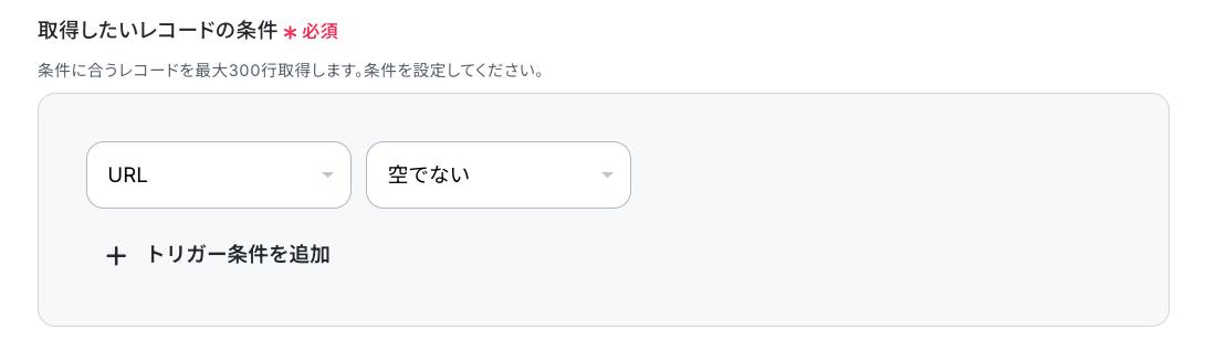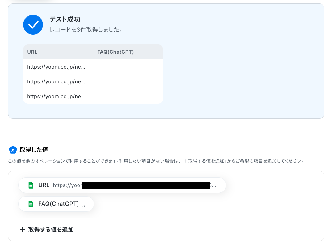 - オペレーションでGoogle スプレッドシートの「複数のレコードを取得する」アクションを設定し、FAQの元となるURLが記載された行の情報を取得します。