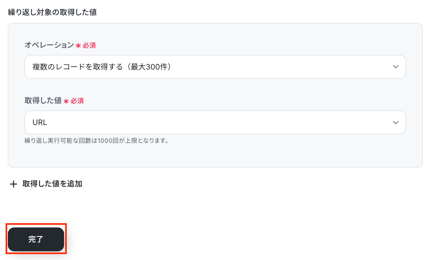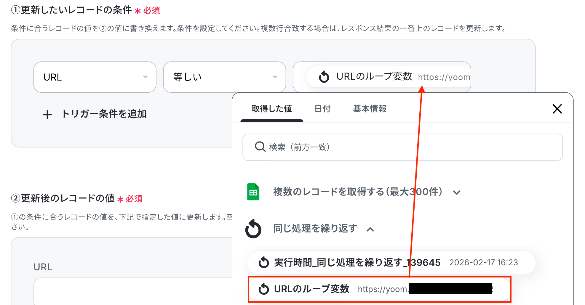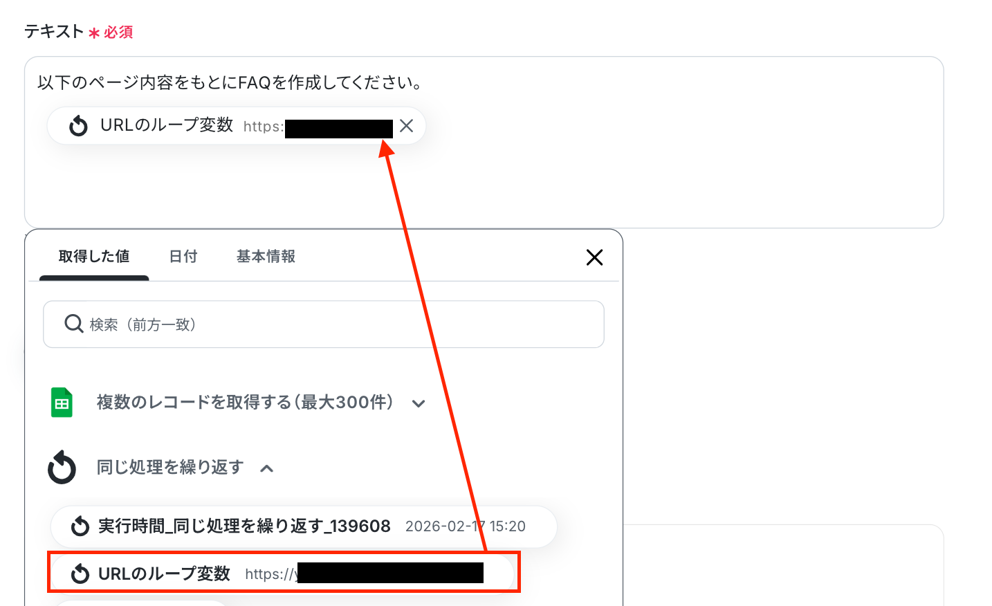 - 次に、「処理繰り返し」を設定し、取得したURLごとに後続の処理を繰り返すようにします。