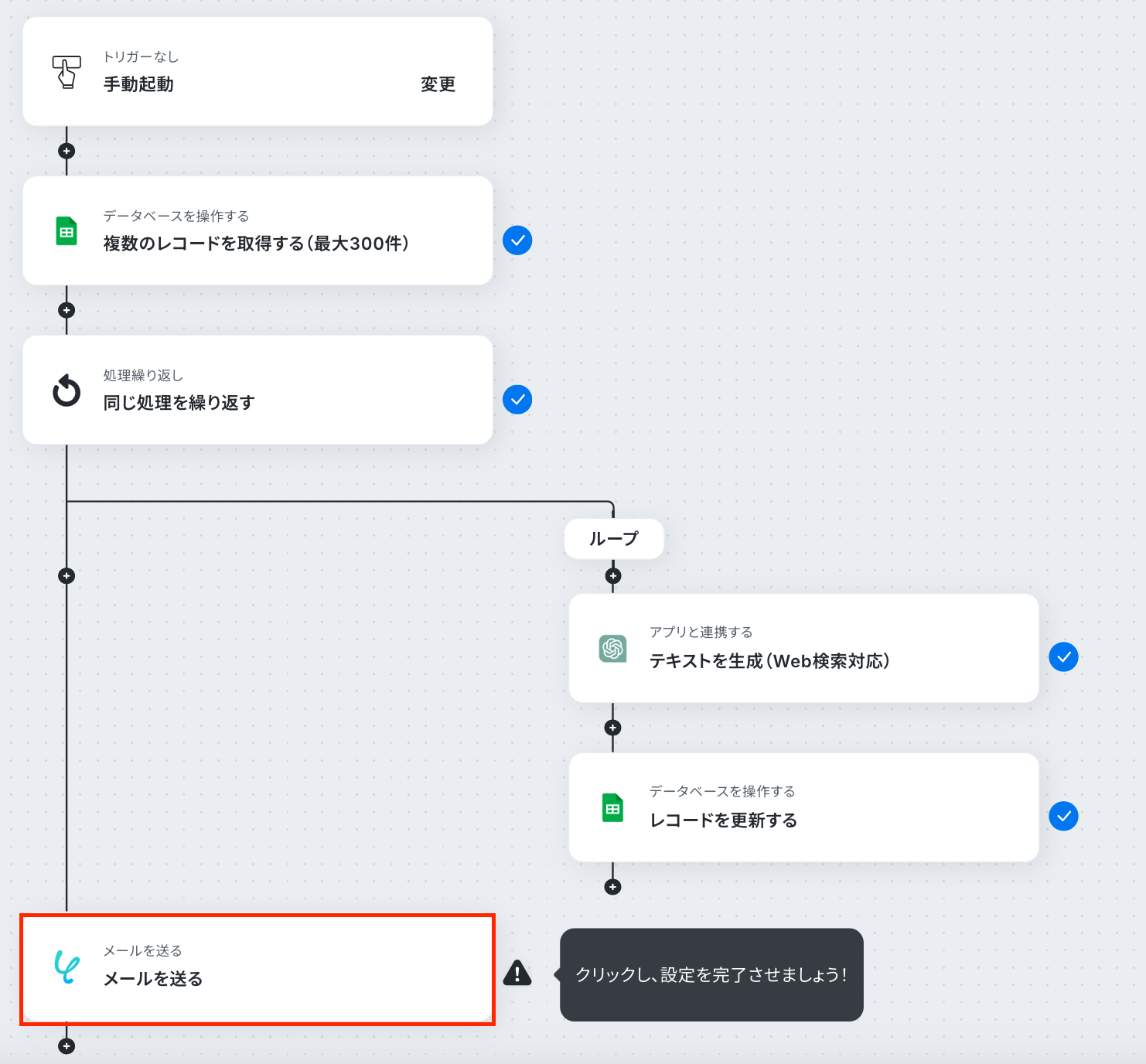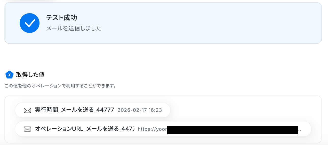 - 最後に、Yoomの「メールを送る」アクションで、処理が完了した旨を担当者へ自動で通知します。