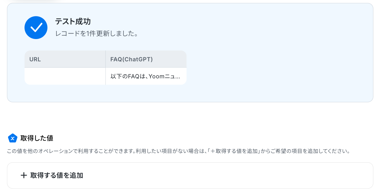 - 生成されたFAQをGoogle スプレッドシートの「レコードを追加する」アクションで指定のシートに書き込みます。