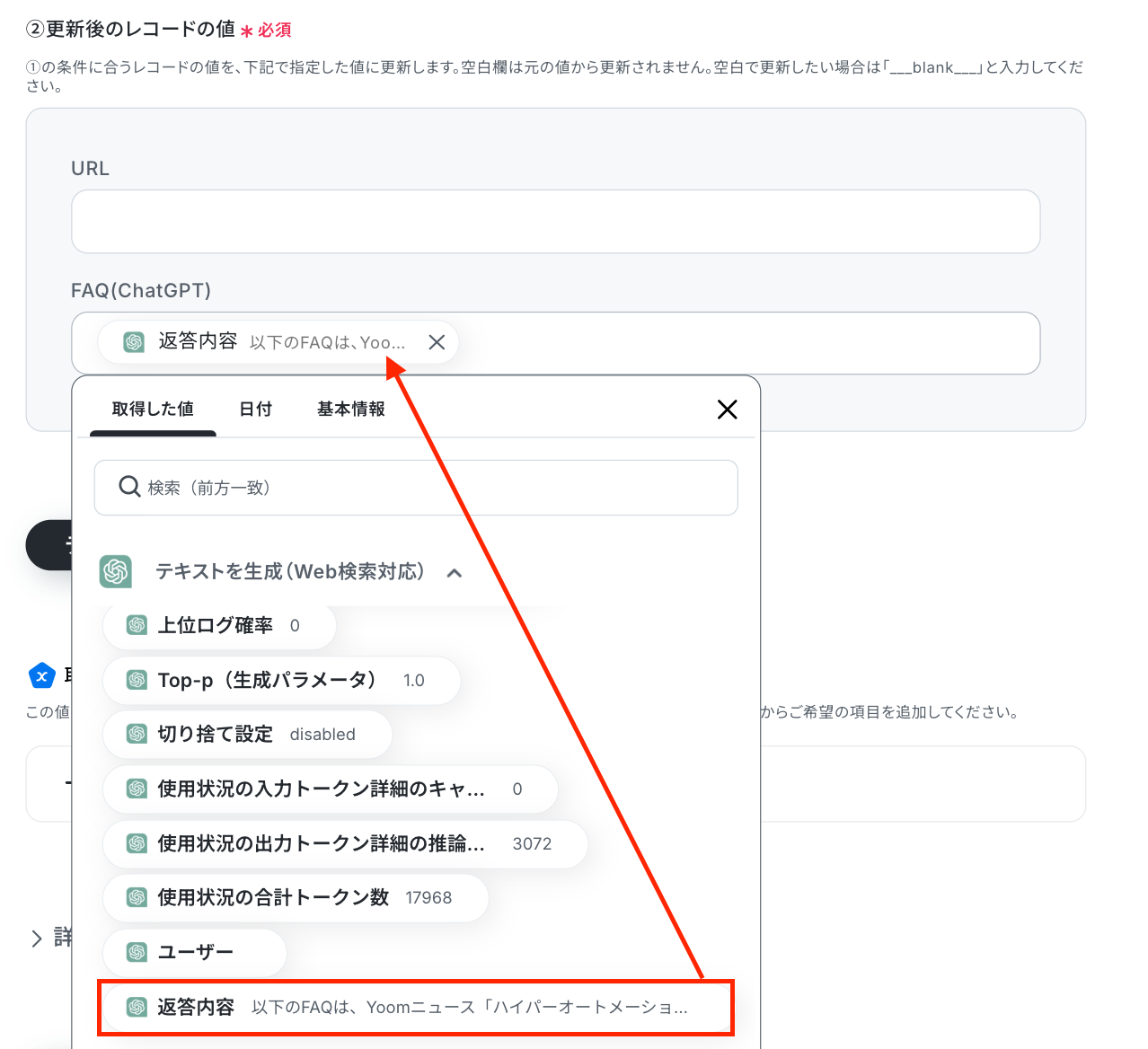 - 繰り返し処理の中で、ChatGPTの「テキストを生成(Web検索対応)」アクションを設定し、取得したURLの内容をもとにFAQを生成するための指示を作成します。