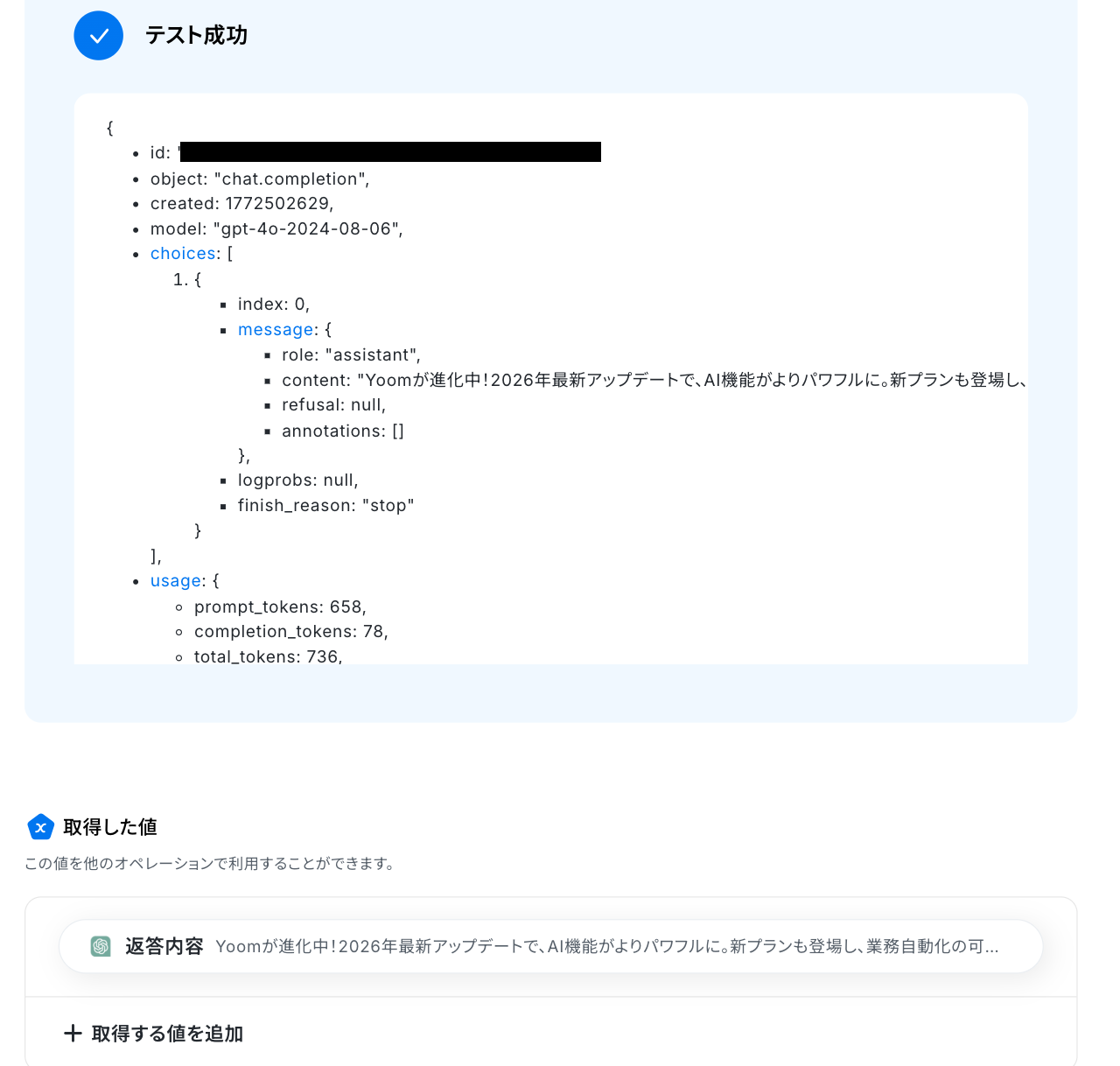 ※ ChatGPT(OpenAI)を使ったアクションを動かすには、OpenAIのAPI有料プランに契約しておく必要があります。APIの利用料金が発生した時にスムーズに支払いができるよう、契約内容を整えておきましょう。 詳しくはOpenAIの「API料金 」ページをご確認ください。