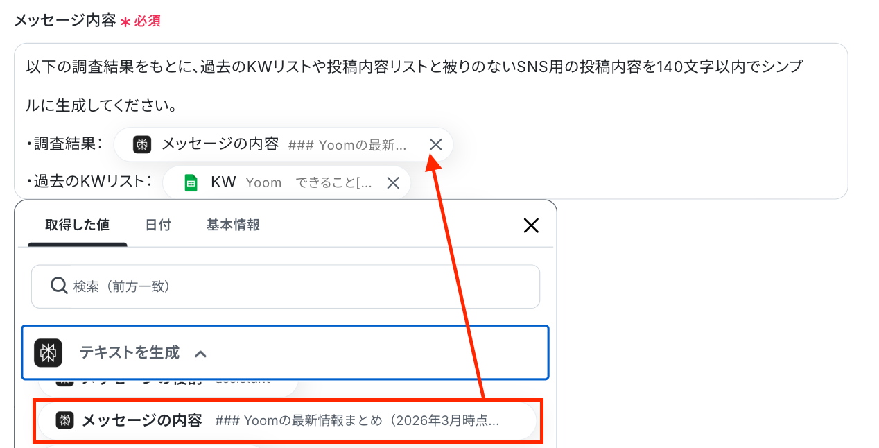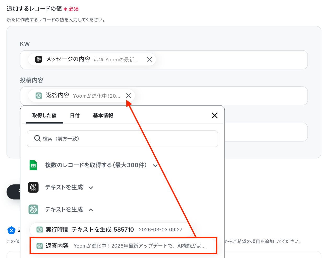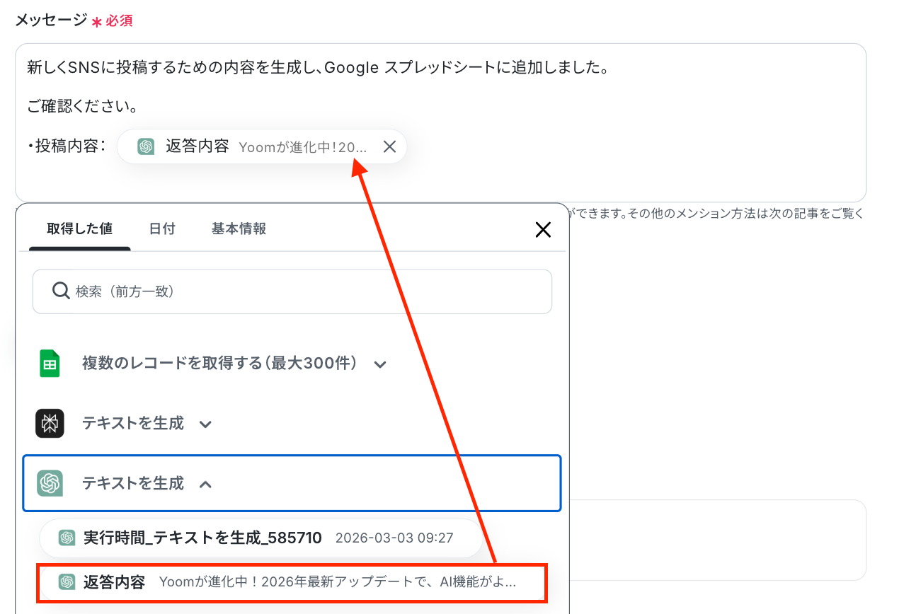 「投稿内容」には、ChatGPTのオペレーションで取得した値を設定します。