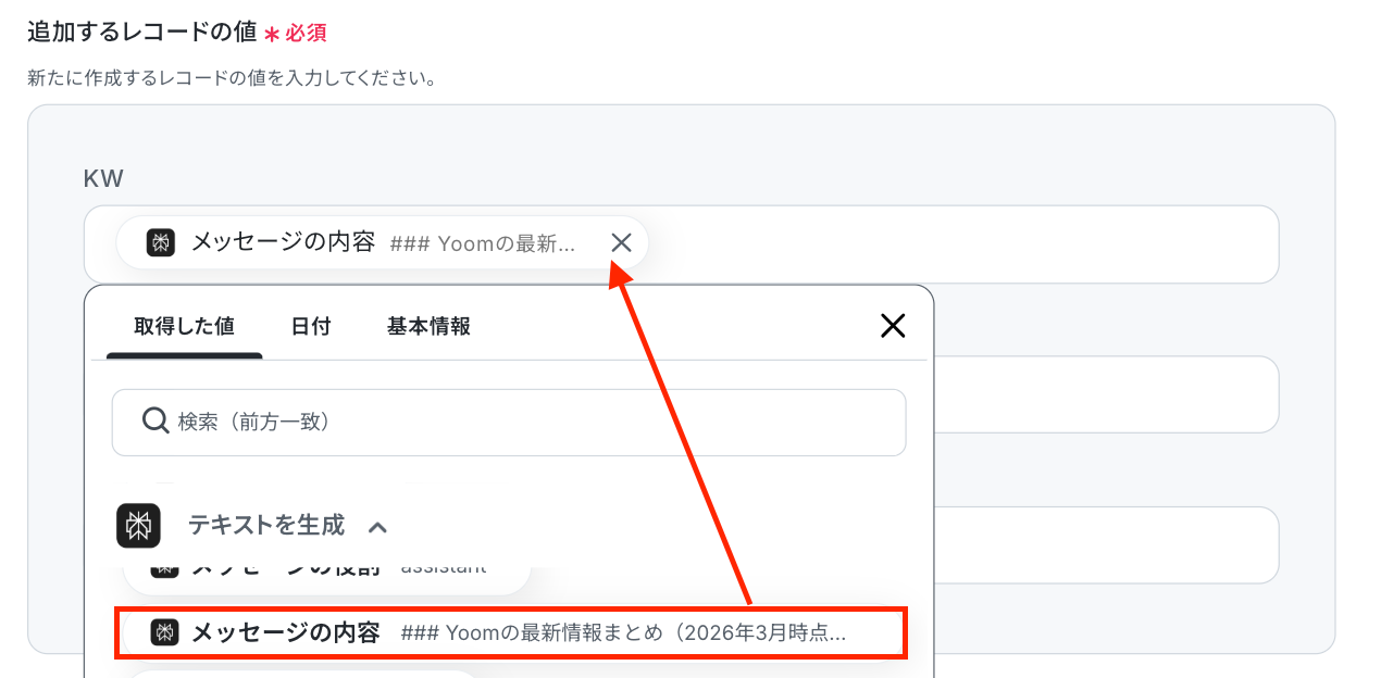 次の画面で「追加するレコードの値」 を設定します。 「KW」には、Perplexityのオペレーションで取得した値から設定してください。