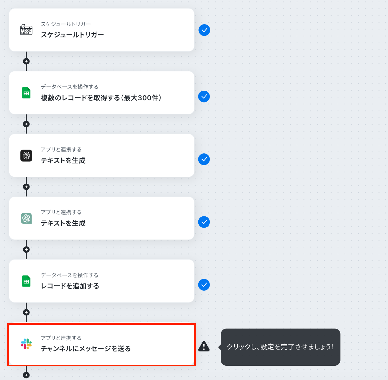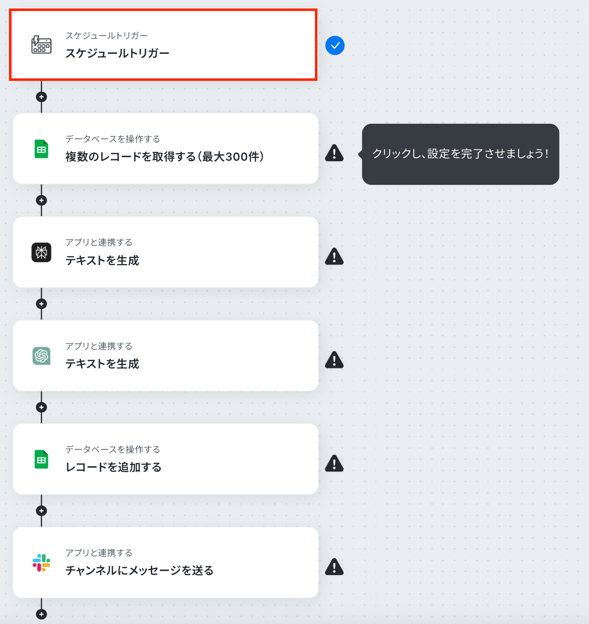スケジュールトリガーでは、フローを起動させたい曜日や時間帯を任意で設定してください。 Google スプレッドシートのオペレーションでは、過去の投稿を取得したり生成した投稿文を記録したりするシートを任意で設定可能です。 PerplexityやChatGPTへの指示内容(プロンプト)は、生成したい投稿文のテイストに合わせて任意の内容に設定してください。 Slackへの通知オペレーションでは、通知先のチャンネルやメッセージ本文を任意の内容に設定することが可能です。 ■注意事項