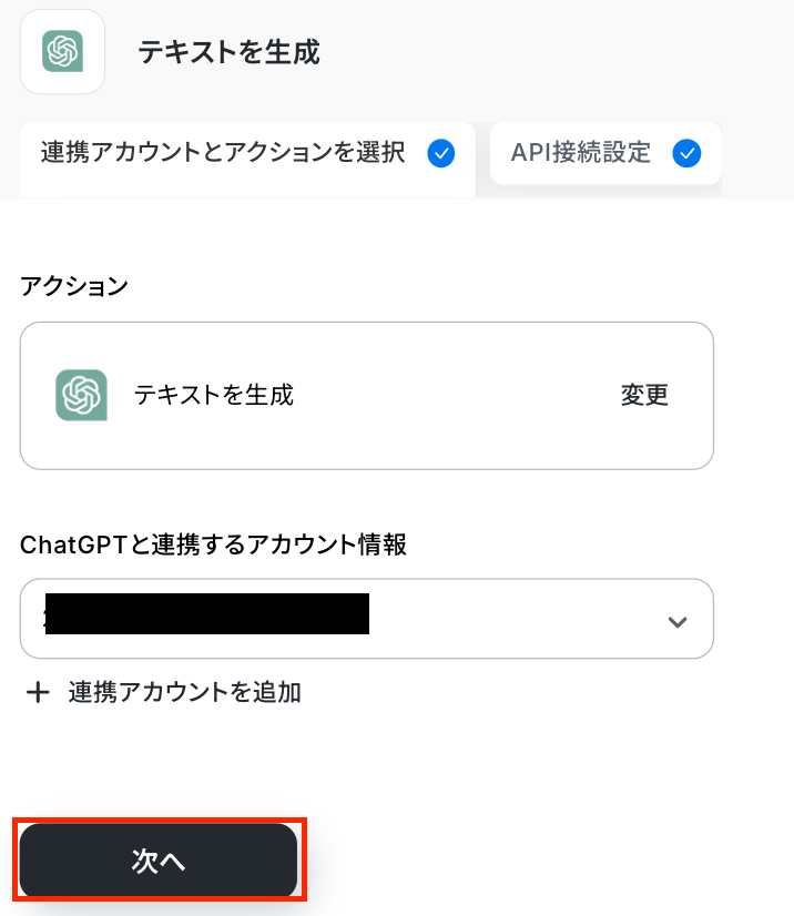アクションはそのままで、連携するアカウント情報を確認します。 確認したら、次に進みましょう!