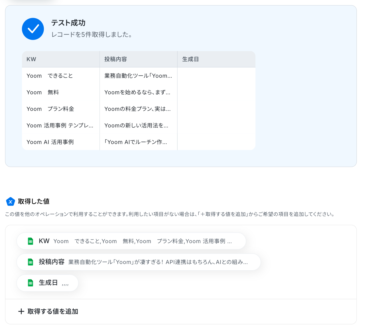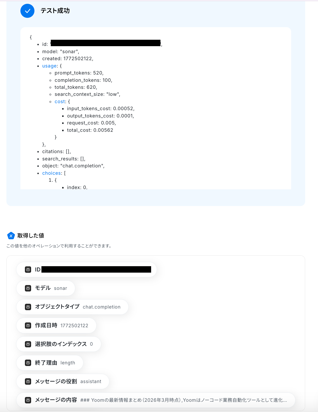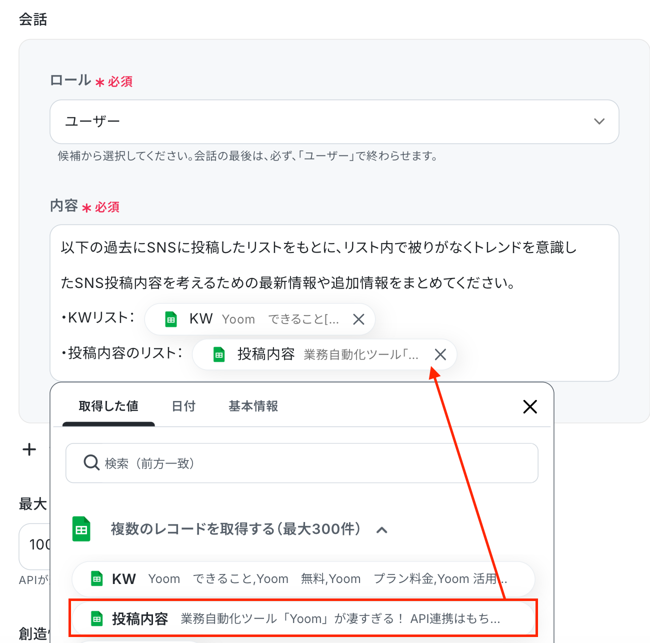 「ロール」 は、プルダウンから選択しましょう。「内容」 には、Perplexityへの指示内容を入力します。 Google スプレッドシートのオペレーションで取得した値を選択しましょう!【Tips】 取得した値を活用することで、フローボットを起動する度に変動する値として反映されます。 これにより、毎回変動する情報を手動で入力する必要がなくなり、効率的に連携できます!