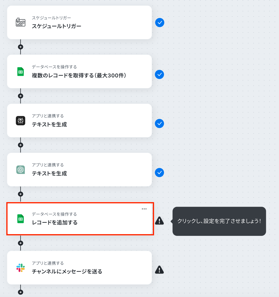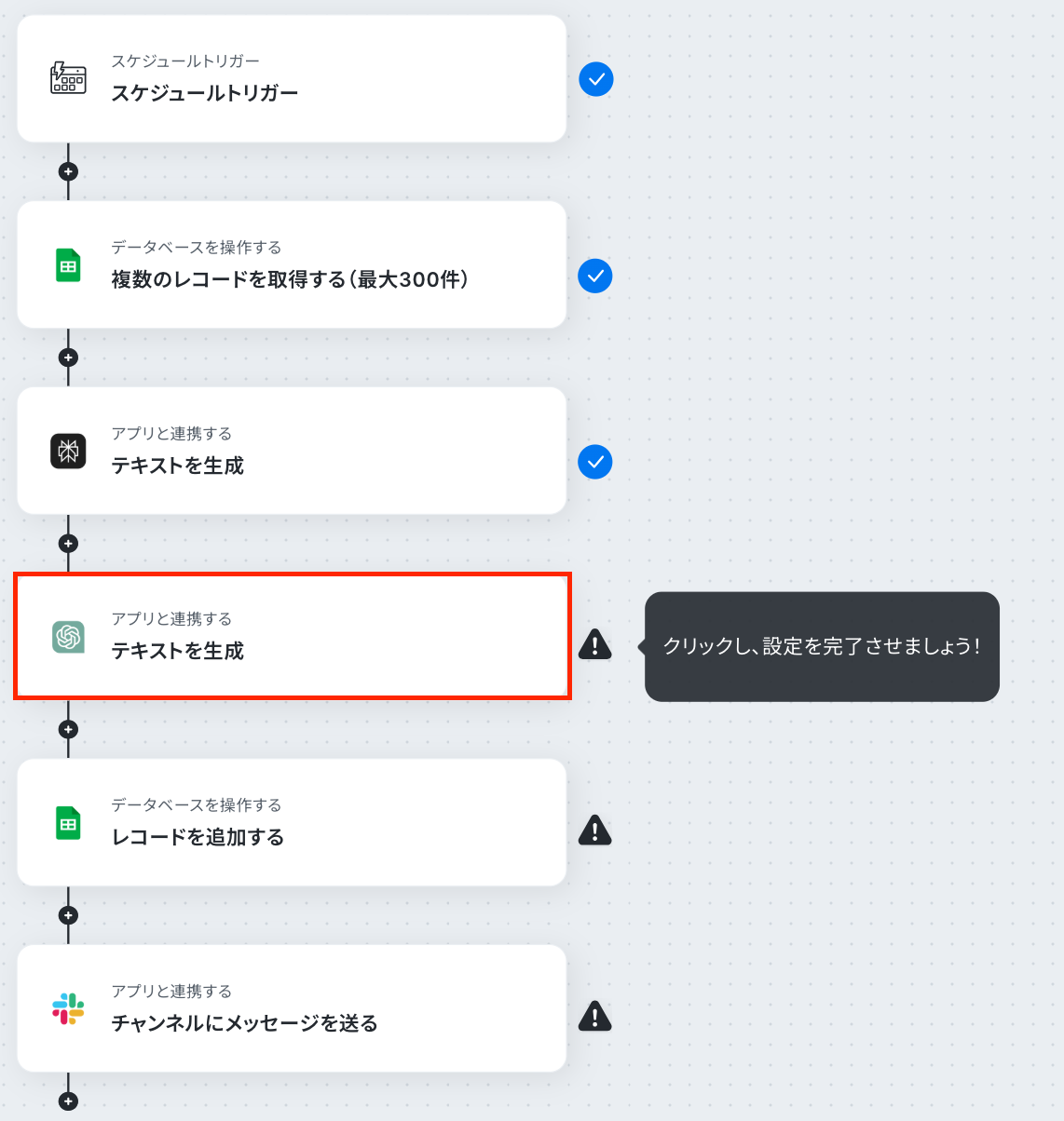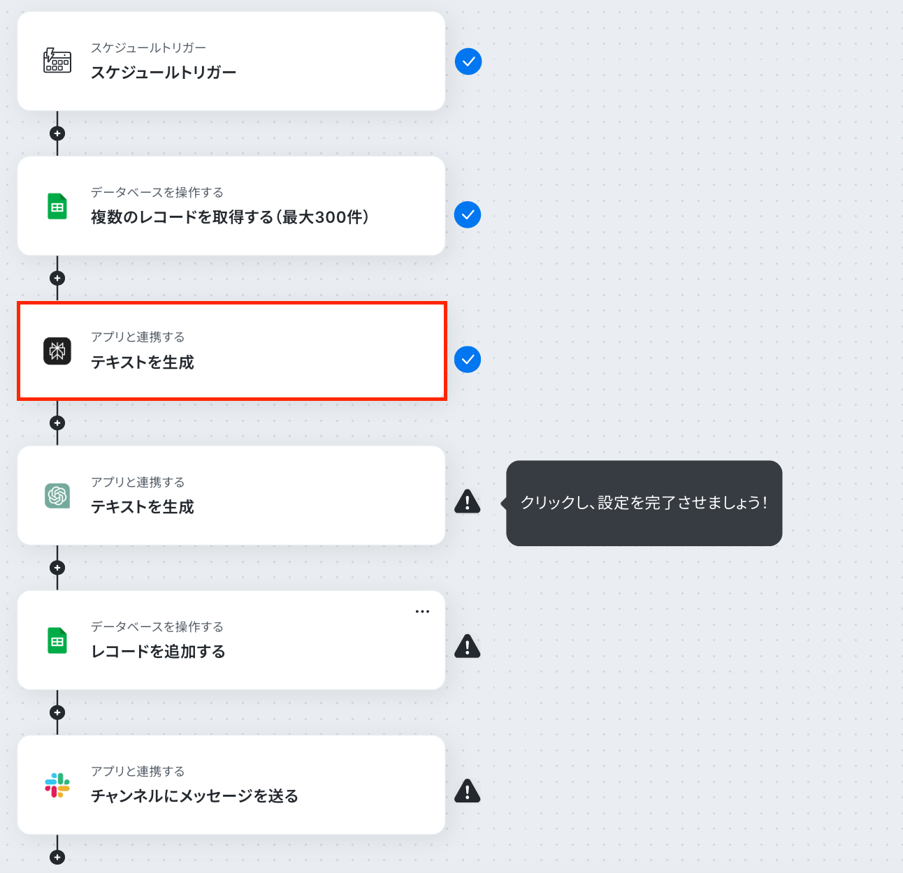 ステップ6:ChatGPTでテキスト生成する設定 次にChatGPTを使用して、SNSへの投稿内容を作成する設定を行っていきます! 赤枠部分をクリックしてください。 ※OpenAIは利用方法により、OpenAI社側への支払いが発生する可能性があります。 詳しくは以下をご確認ください。ChatGPT/OpenAIと連携してできること