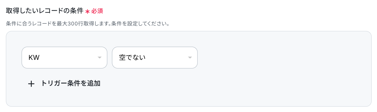 次に進むと、「取得したいレコードの条件」 を設定する画面に遷移します。 今回は「 KW」が「空でない」レコードを取得するように設定しました。 テストボタンをクリックしましょう!