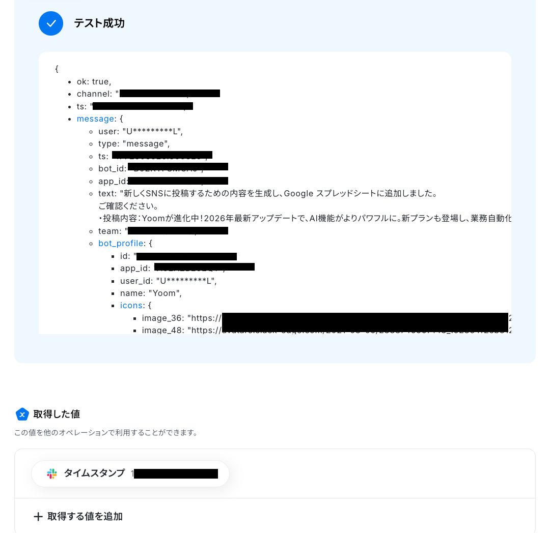 テストをクリックします。 「テスト成功」の表示を確認し、Slackに通知されているか確認しましょう!