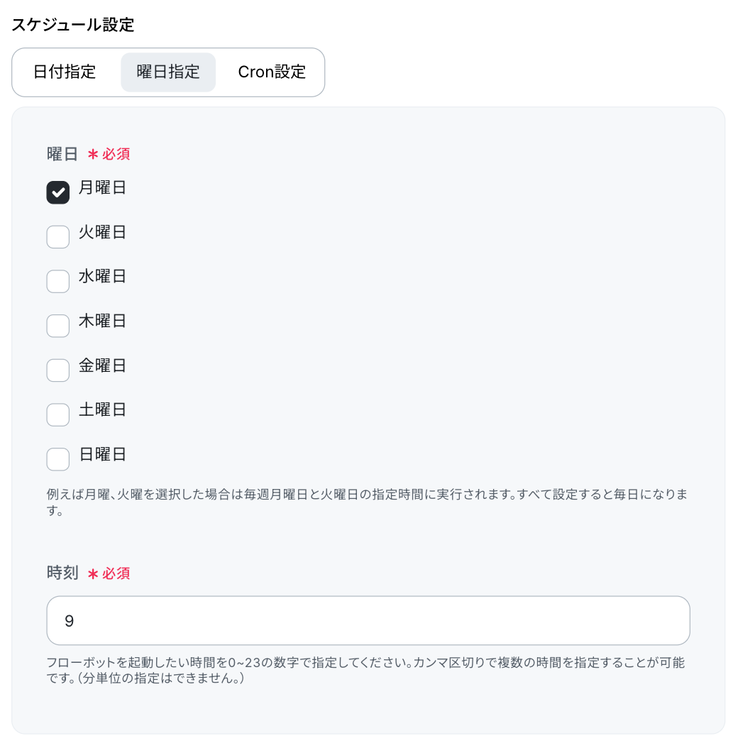 「スケジュール設定」では、フローボットを起動したい日付や時刻を設定します。 今回は以下の設定にしましたが、自由に設定してOKです。 設定を終えたら「完了」をクリックしましょう!