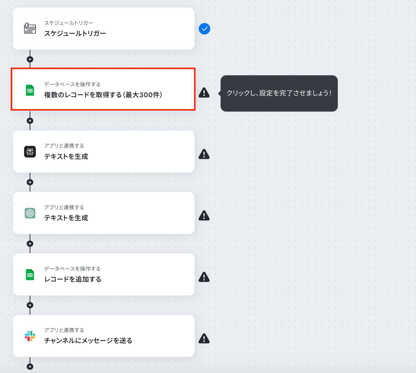 ステップ4:複数のレコードを取得する設定 赤枠をクリックしてください。 ここでは、Google スプレッドシートの複数のレコードを取得する設定を行います。
