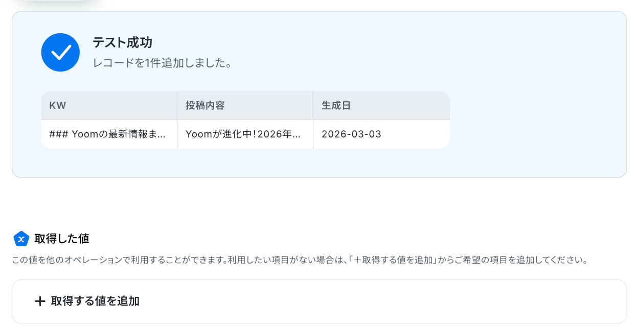 取得した値を確認できたら「完了」をクリックしてください!※ 取得した値 とは? トリガーやオペレーション設定時に、「テスト」を実行して取得した値のことを指します。 後続のオペレーション設定時の値として利用でき、フローボットを起動する度に変動した値となります。