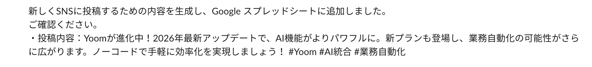 Google スプレッドシートの情報をもとにSlackへの投稿を自動生成するフローを作ってみよう それではここから代表的な例として、定期的にGoogle スプレッドシートの情報をもとにAIがSNS投稿を生成し、Slackに自動で投稿する フローを解説していきます!