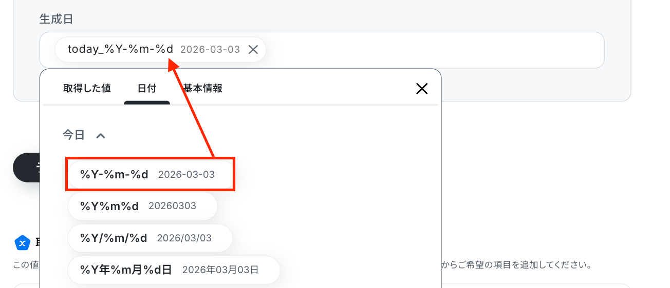 「日付」には、日付変数を使用して設定しましょう。 日付変数を設定することで、フローボットを起動した日時が自動で反映されます。日付変数について