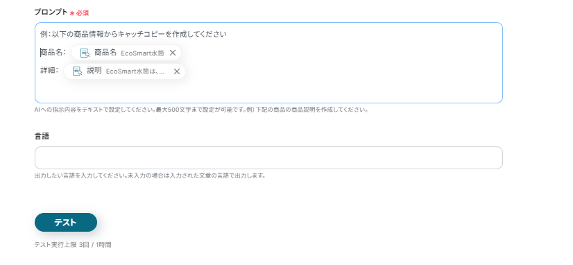 商品名と商品説明を元に、キャッチコピーを生成するように入力しています。