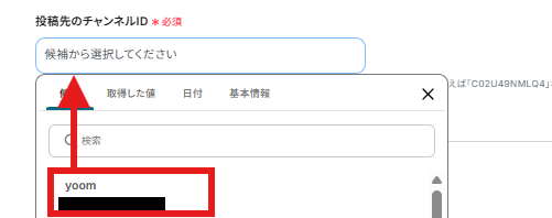 投稿先のチャンネルIDは、下に表示される候補から選択します。