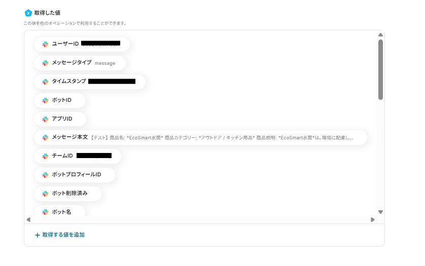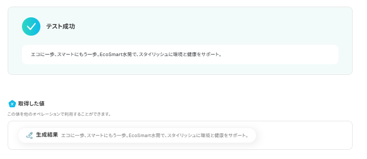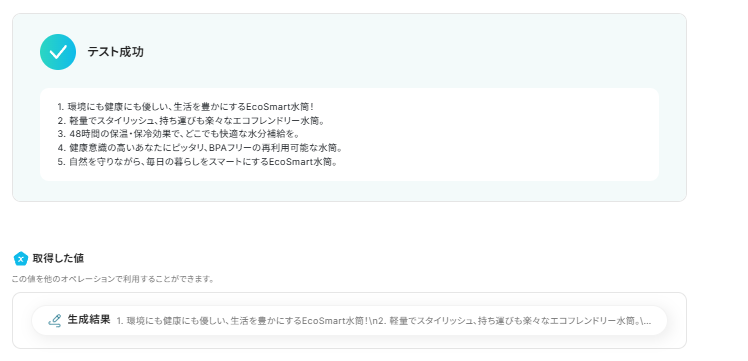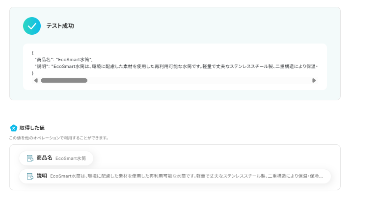 テスト成功後、抽出した商品名と説明をアウトプットとして使用することができるようになります。