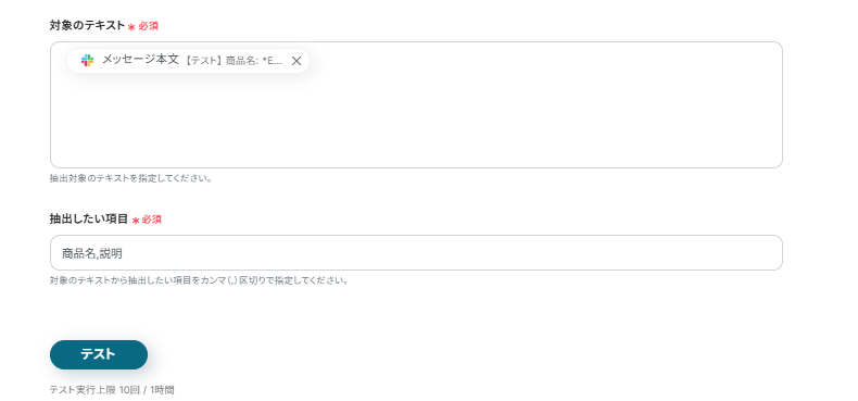 詳細を設定する画面では、Slackに投稿された商品情報から「商品名、説明」を抽出するように設定されています。