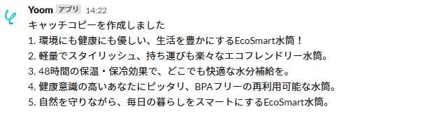 SlackやChatworkなどのチャットツールで商品情報を受け取った際に、その情報をもとにAIがキャッチコピーを自動生成し、結果をチャットで通知します。