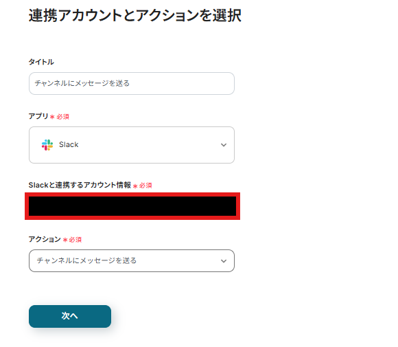 連携アカウントとアクションを選択する画面が表示されるので、連携するSlackのアカウントで間違いないかを確認し「次へ」をクリックしましょう。