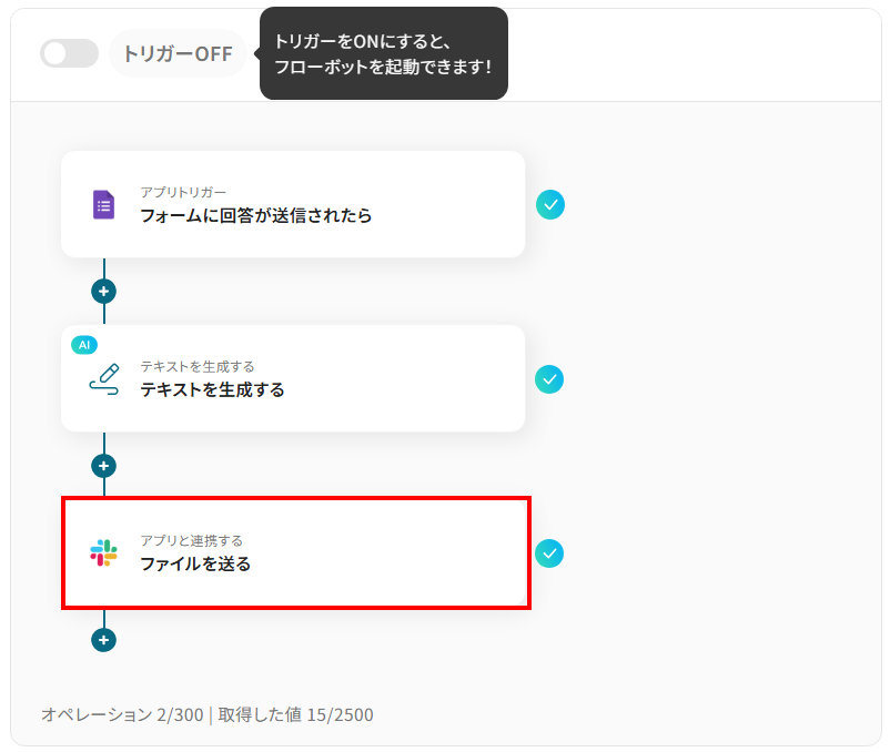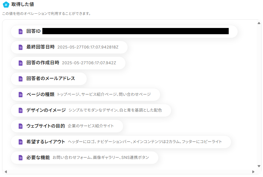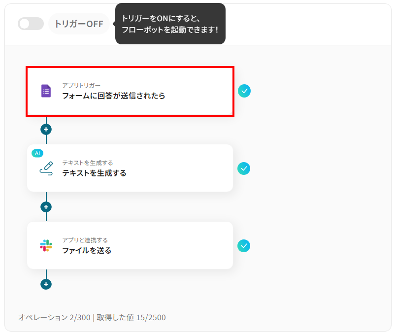 ※Googleフォームをトリガーに設定した場合の回答データの取得方法については、こちらを参考にしてみてくださいね。