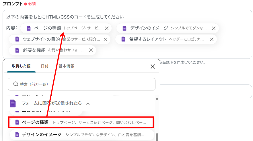 プロンプト欄をクリックすると、下記のようなアウトプットが表示されるので、先ほど生成したテキストを選択しましょう。
