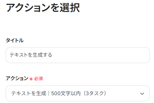 アクションは、デフォルトで「テキストを生成|500文字以内(3タスク)」が選択されています。こちらは変更可能なので、()内に表記されている消費タスク量に注意して選択してください。