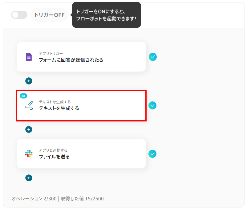 - Googleフォームのトリガー設定、AIによるテキスト生成設定、Slackのアクション設定
