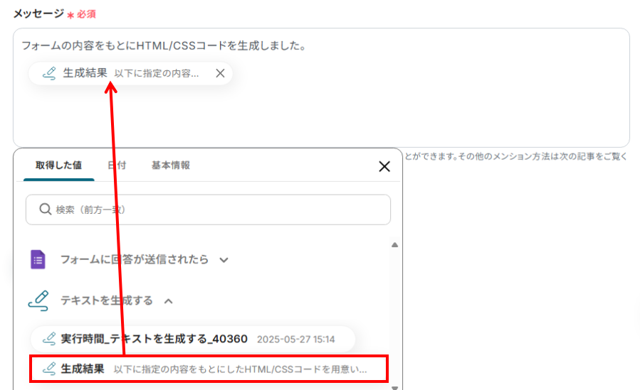 - メッセージ:入力欄をクリックすると、下図のようにアウトプットが表示されます。アウトプットを活用して、お好みでメッセージ内容を入力してください。