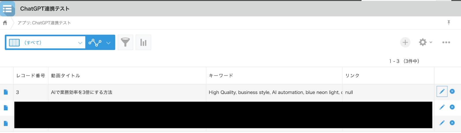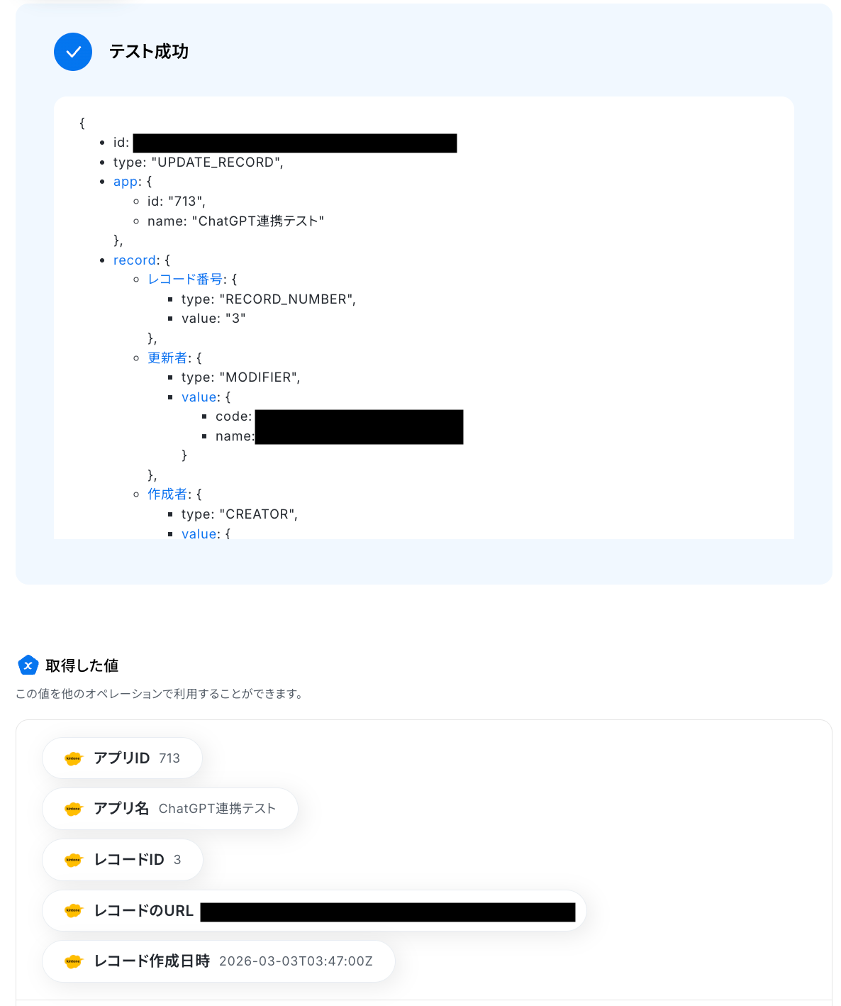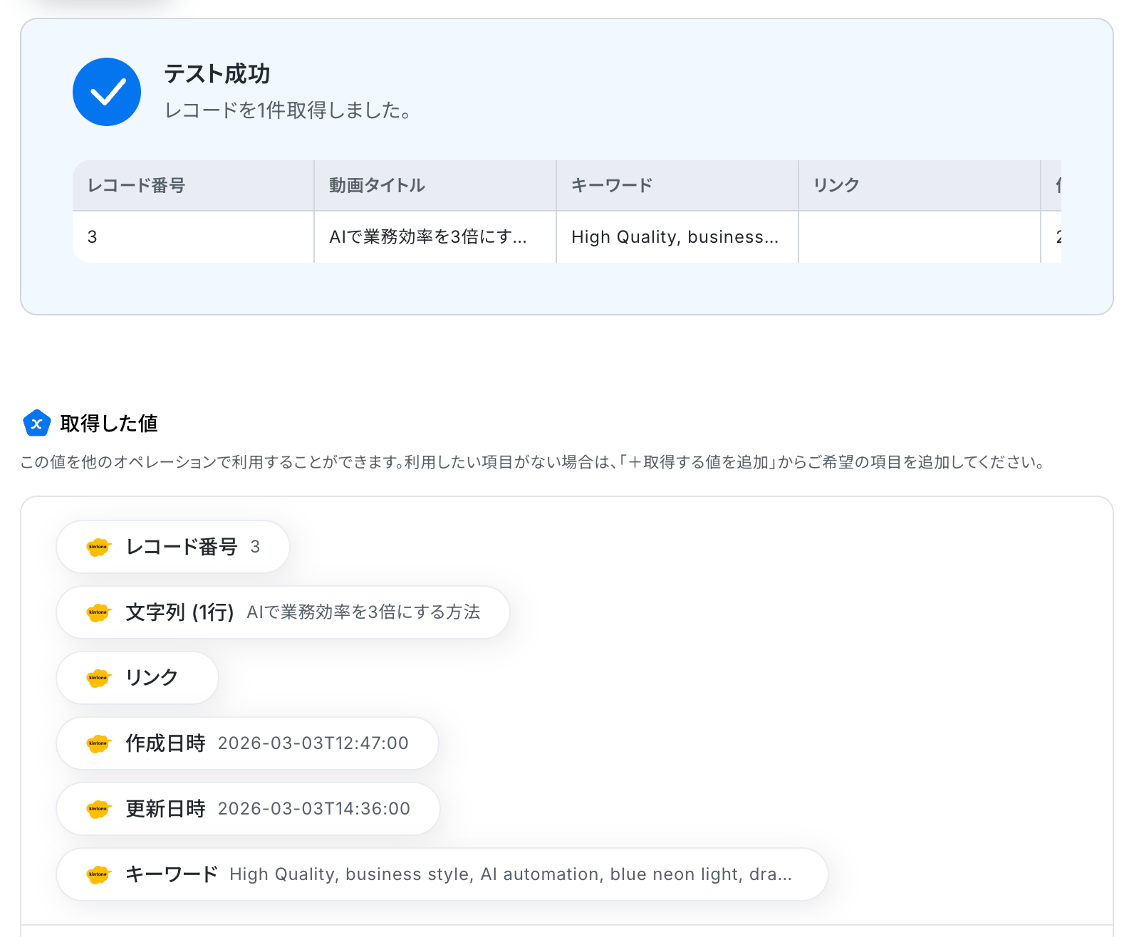 テストに成功すると、kintoneに登録されたレコード情報が表示されます。