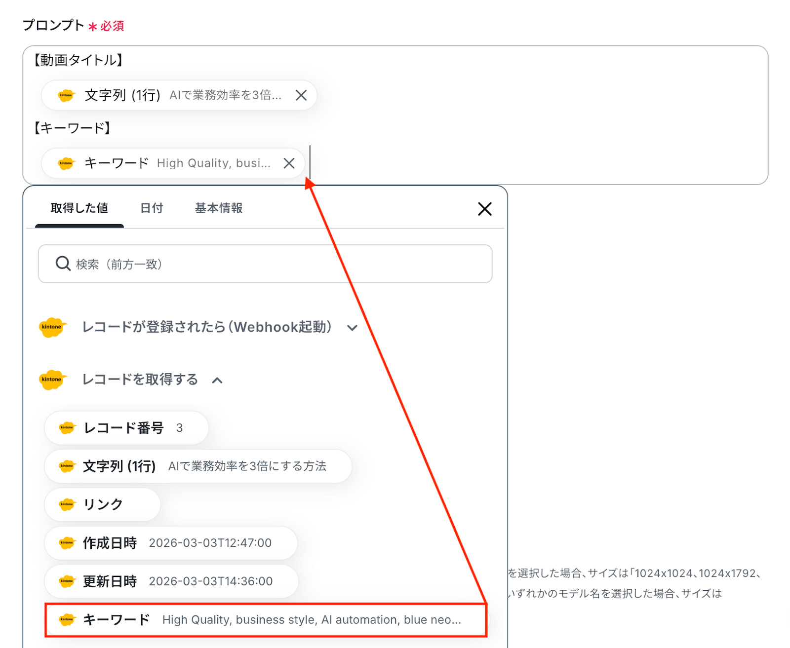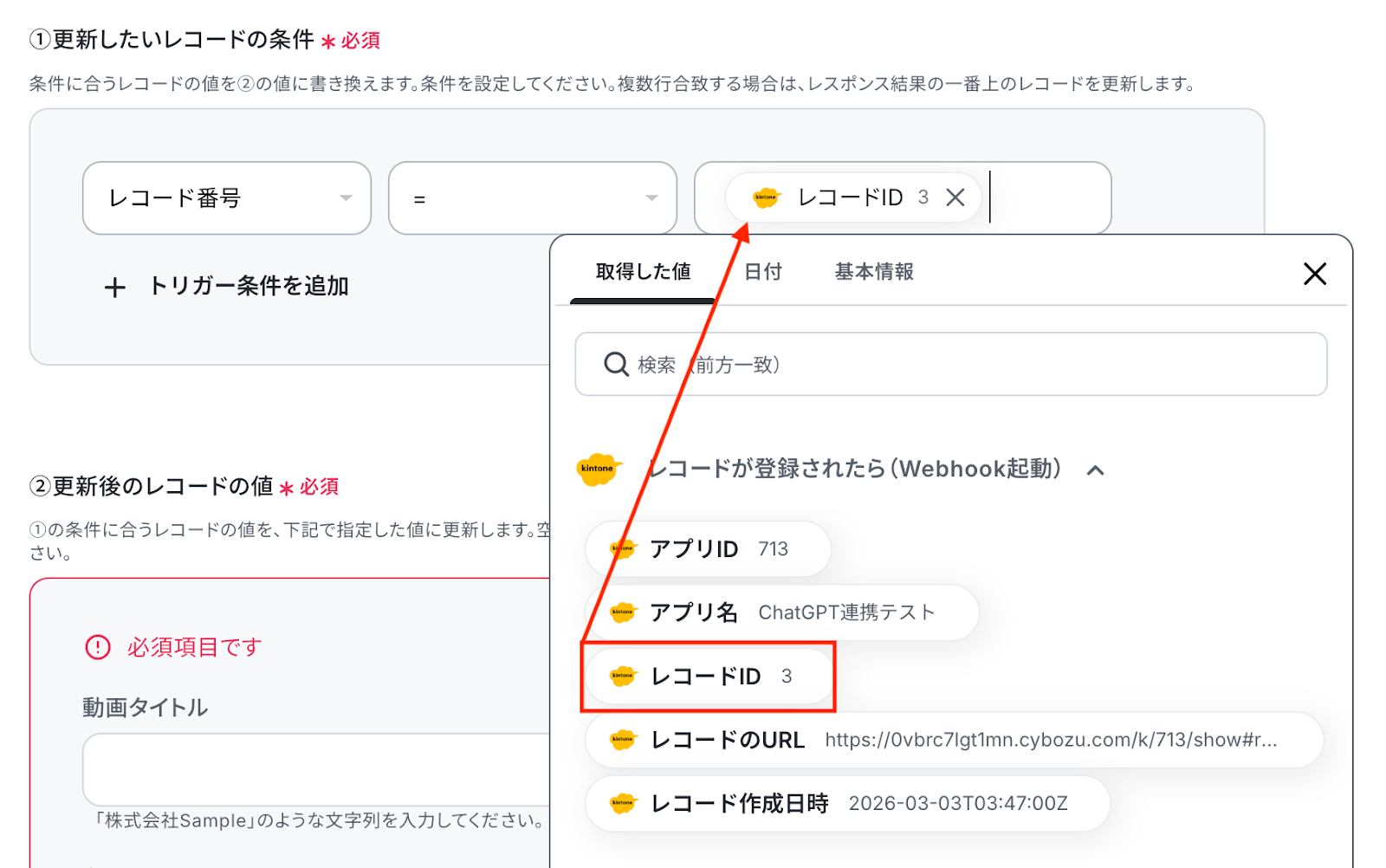入力欄をクリックすると、前のステップでkintoneから取得した値が表示されるため、該当する値を選択して入力します。