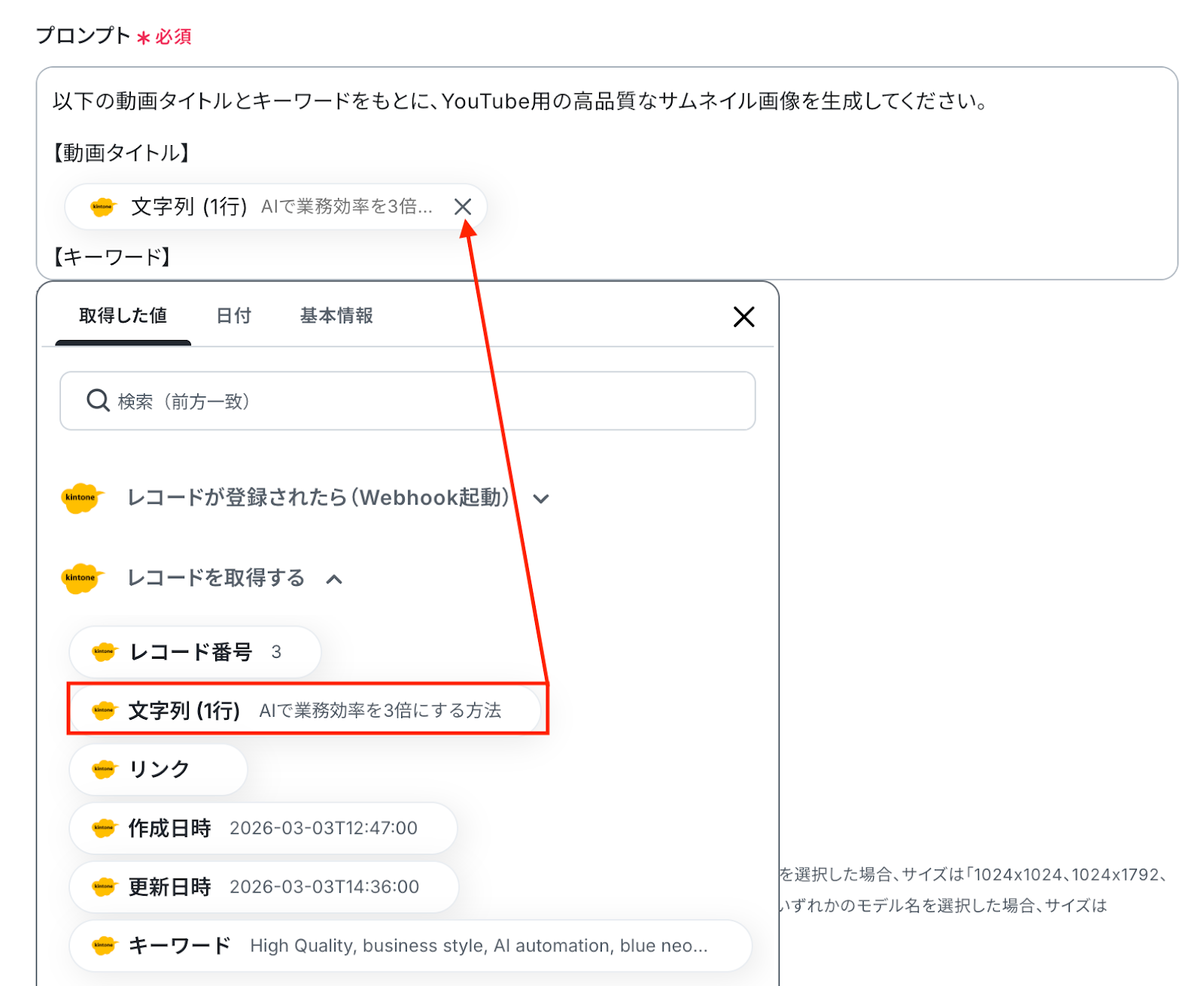 今回はkintoneから取得した値を活用しYouTube用のサムネイルを生成するため、以下のプロンプトを設定しました。