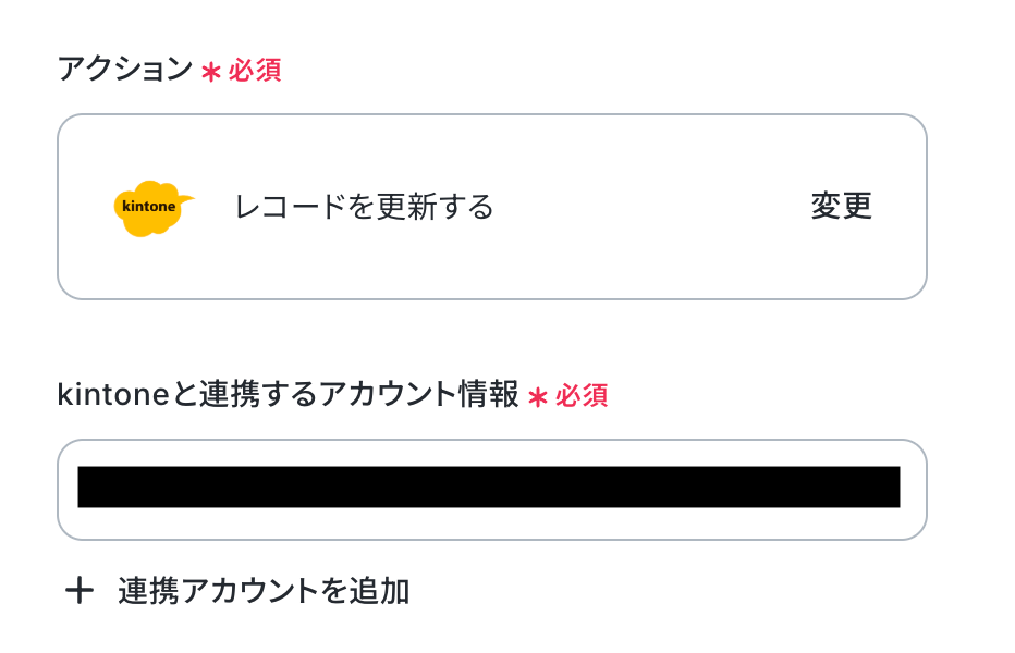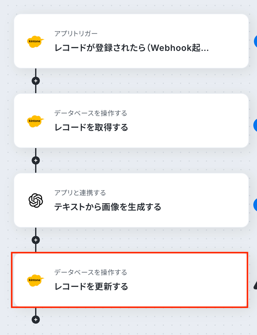 - 最後に、オペレーションでkintoneの「レコードを更新する」アクションを設定し、生成された画像のURLを該当レコードに書き込みます。
