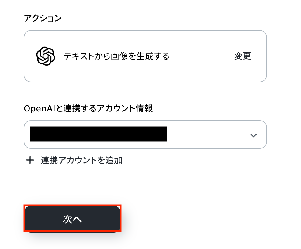OpenAIと連携するアカウント情報に問題がなければ、「次へ」をクリックします。