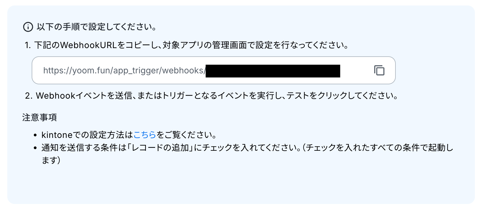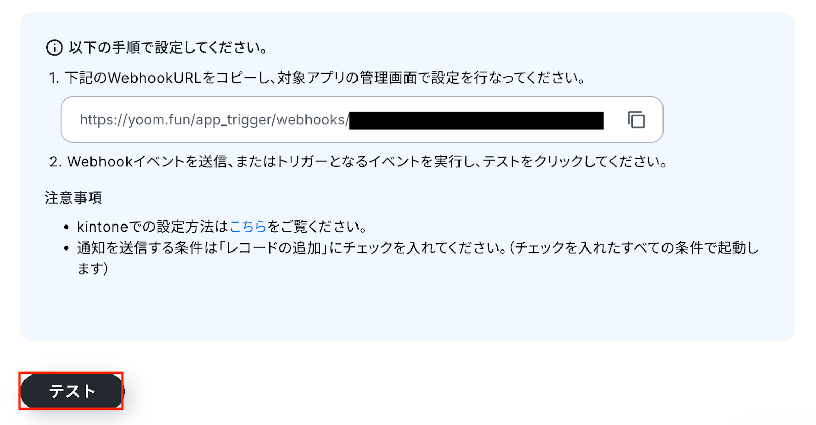 この設定により、レコードの登録といったイベントが発生した際に、その内容がWebhook経由で自動的に通知され、Yoom側で処理を開始できるようになります。