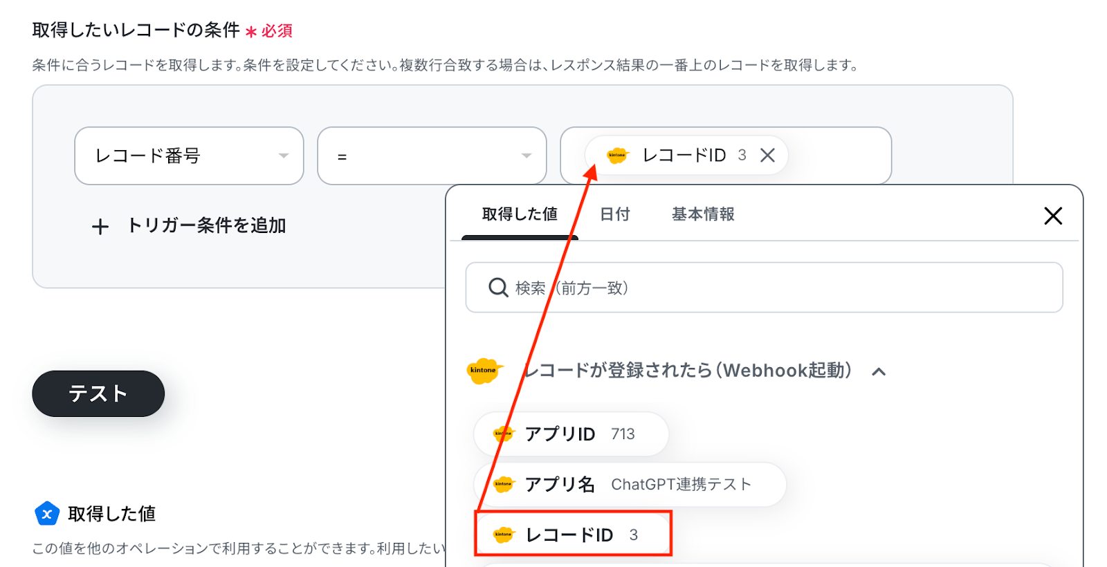 入力が完了したら「テスト」をクリックして、設定した内容でレコードが取得されるか確認しましょう。