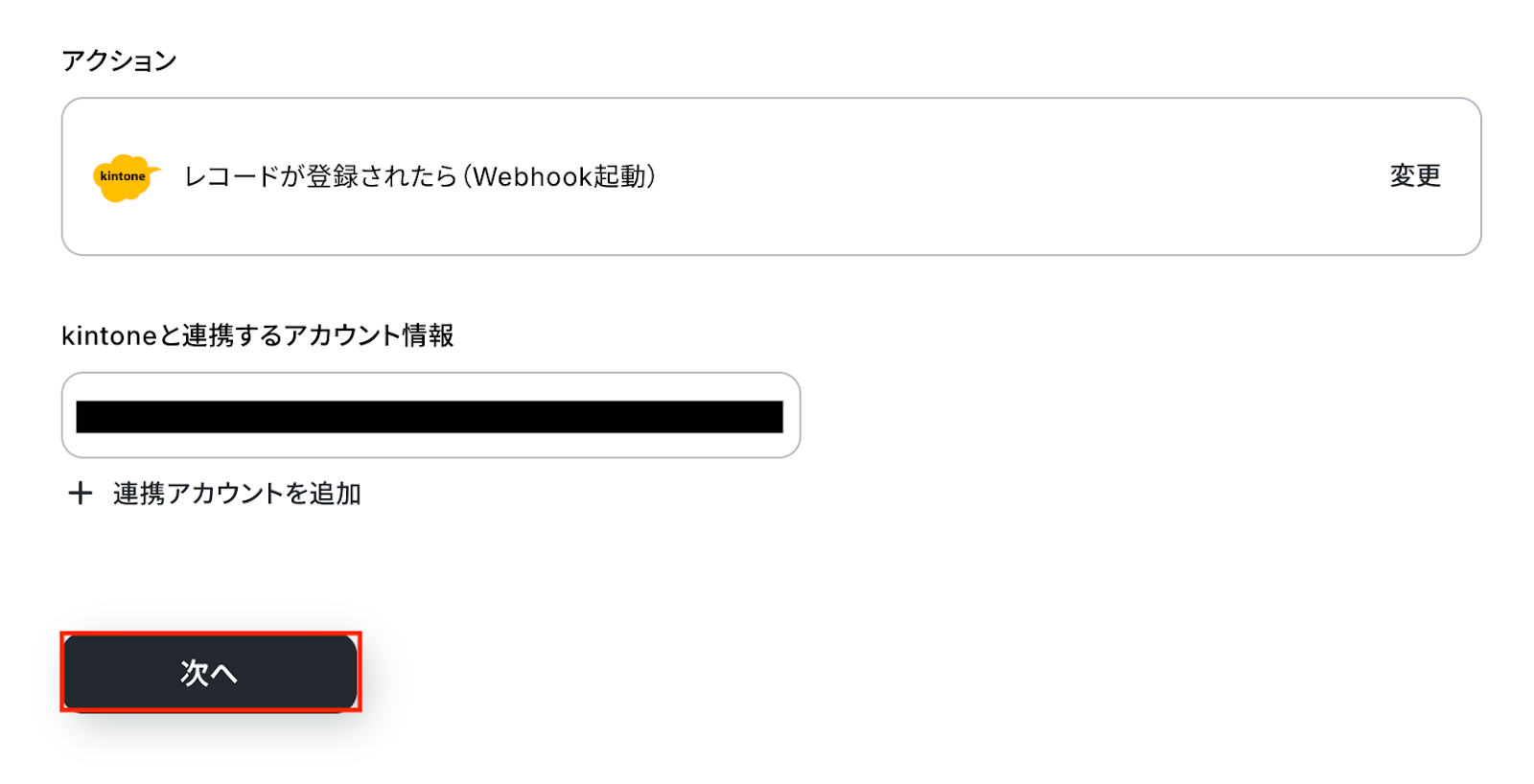 kintoneと連携するアカウント情報に問題がなければ、「次へ」をクリックします。