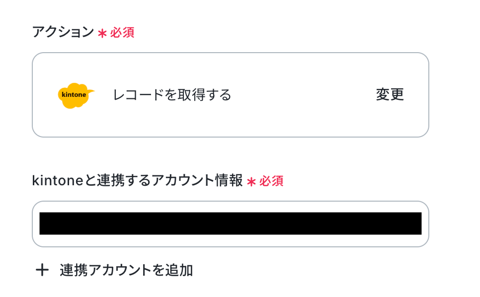 なお、テキストを直接入力した部分は固定値とされるため、取得した値を活用せず設定を行うと毎回同じレコードがkintoneから取得されてしまうので注意が必要です。