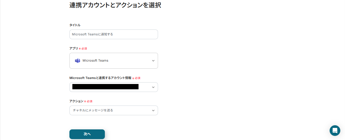 3.Microsoft Teamsの「チャネルにメッセージを送る」というオペレーションで、連携アカウントや送信先のチャットルーム、メッセージ内容を設定してください。