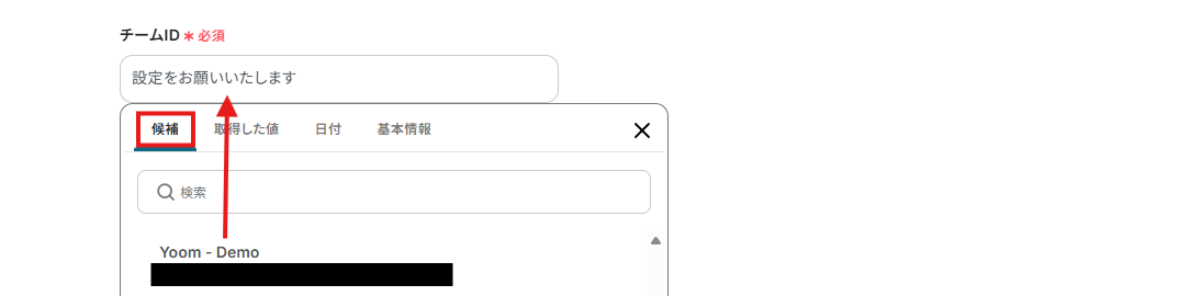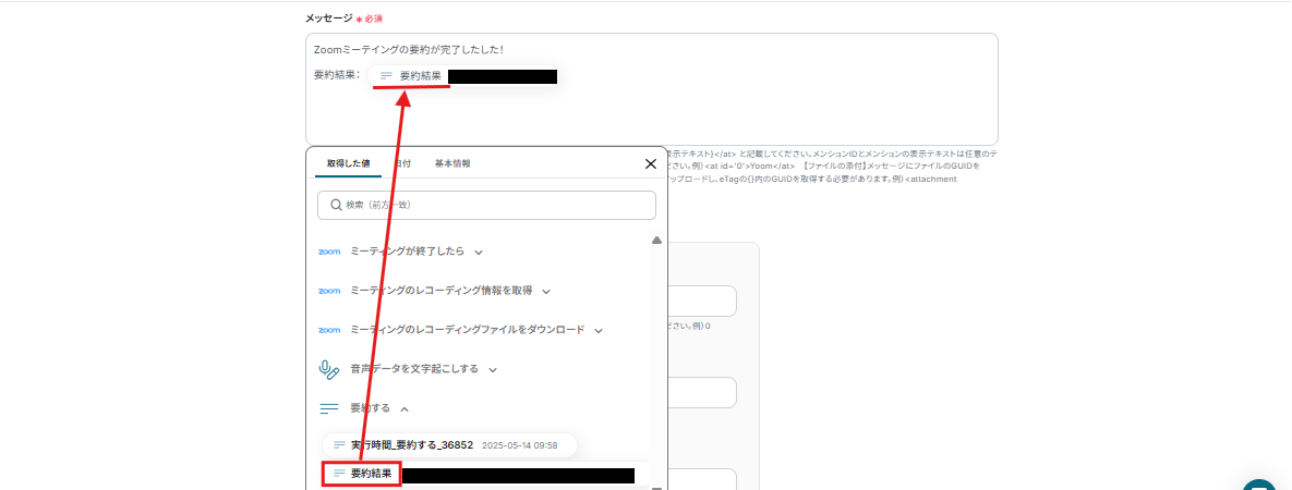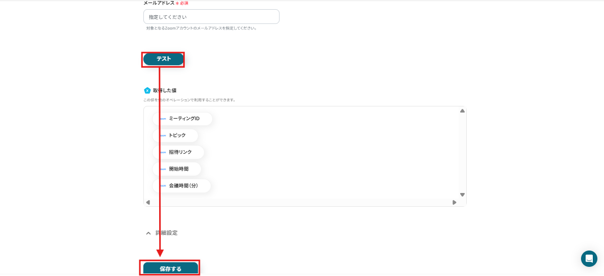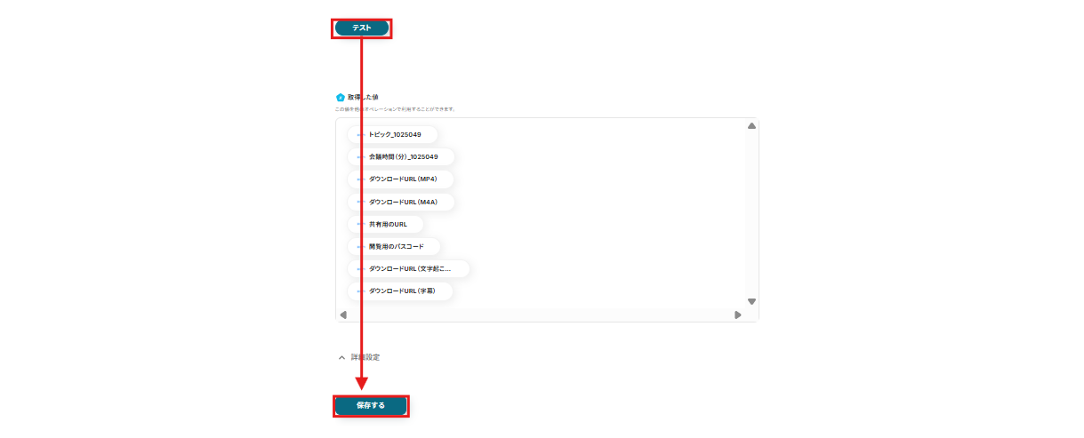 テストが成功すると先ほど終了したZoomのミーティング情報が取得した値として取得されます。この取得した値は、この後行う設定で使用