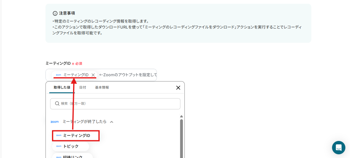 Zoomミーティングが終了したら自動で「ミーティングID」を引用しレコーディング情報を取得することができますよ!