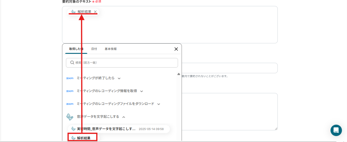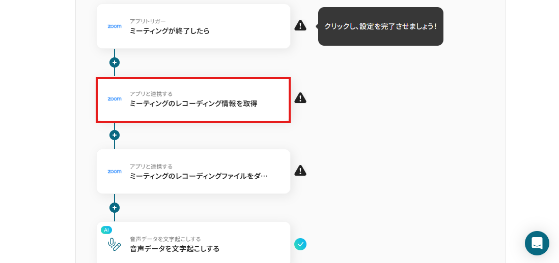前のステップで取得したZoomミーティングの音声ファイルを文字起こしする設定を行います。